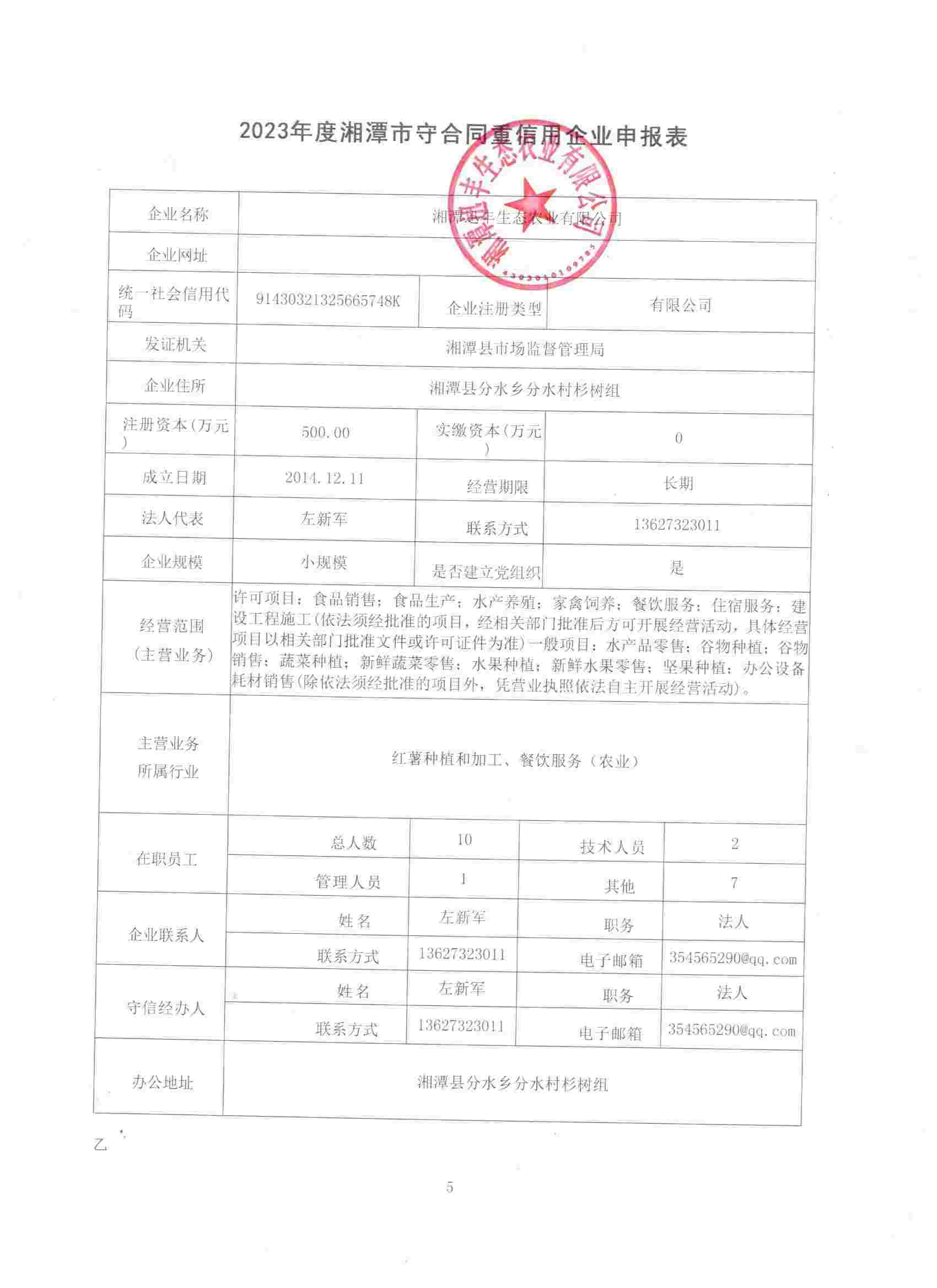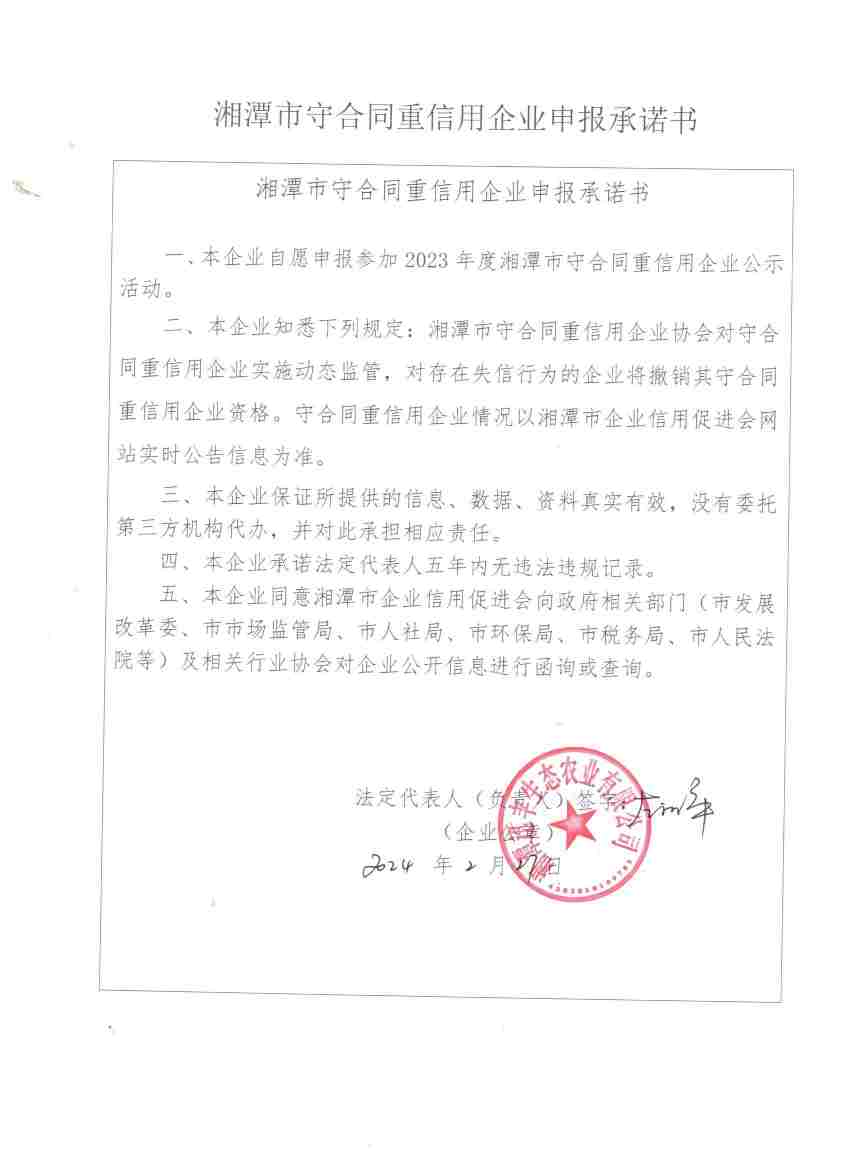 本企業(yè)根據(jù)《湘潭市守合同重信用企業(yè)申報(bào)規(guī)定》等編制 2023 年度企業(yè)信用報(bào)告書,并保證本報(bào)告書內(nèi)容真實(shí)、準(zhǔn)確、完整。